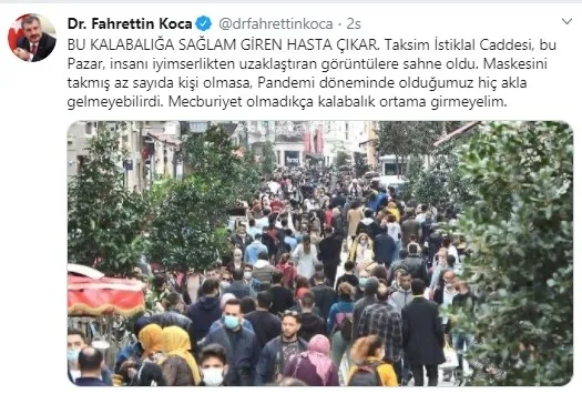 Fotoğrafı, "Bu kalabalığa sağlam giren hasta çıkar" başlığıyla paylaşan Koca, "Taksim İstiklal Caddesi, bu pazar, insanı iyimserlikten uzaklaştıran görüntülere sahne oldu. Maskesini takmış az sayıda kişi olmasa pandemi döneminde olduğumuz hiç akla gelmeyebilirdi. Mecburiyet olmadıkça kalabalık ortama girmeyelim." açıklamasını yaptı.