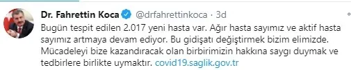 Sağlık Bakanı Fahrettin Koca, "Bugün tespit edilen 2.017 yeni hasta var. Ağır hasta sayımız ve aktif hasta sayımız artmaya devam ediyor. Bu gidişatı değiştirmek bizim elimizde. Mücadeleyi bize kazandıracak olan birbirimizin hakkına saygı duymak ve tedbirlere birlikte uymaktır." dedi.
