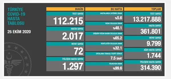 Toplam test sayısı 13 milyon 217 bin 888'e ulaştı. Hasta sayısı 361 bin 801, vefat sayısı 9 bin 799, ağır hasta sayısı 1744, aktif hasta sayısı 37 bin 612 oldu.