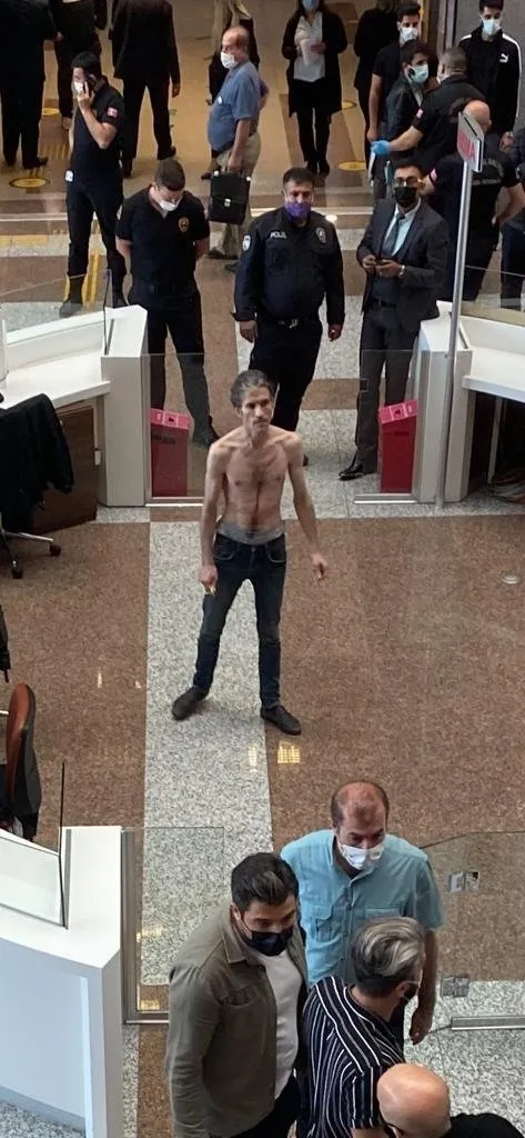 İsminin Murat Ateş olduğu öğrenilen şahıs, cebinden falçata çıkarıp vücudu kesti. Güvenlik görevlilerince etkisiz hale getirilen Ateş, gözaltına alındı ve tedavisinin yapılması için hastaneye sevk edildi. (Dilek Yaman Demir/Sabah)