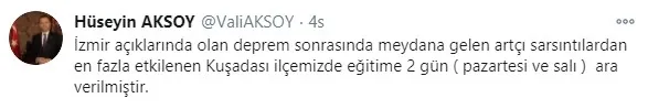 Son dakika... İzmir'de meydana gelen ve Aydın'ın Kuşadası'ndaki bazı binalarda da hasara neden olan 6.6 büyüklüğündeki deprem nedeniyle Aydın Valisi Hüseyin Aksoy, sosyal medya hesabından ilçede eğitime 2 gün ara verildiğini duyurdu.