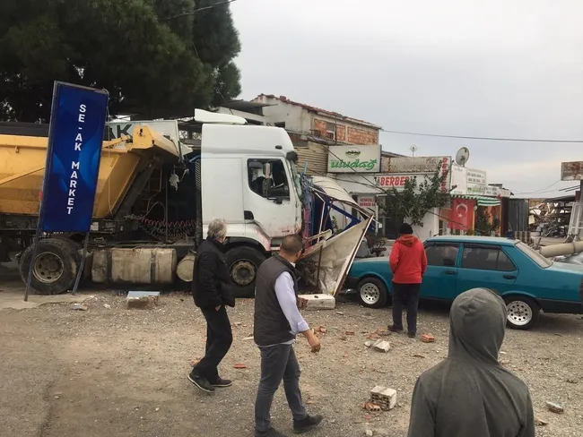 İzmir'in Dikili ilçesinde kontrolden çıkan bir kamyon, 11 araca çarptı. Korkunç anlar güvenlik kamerası tarafından kaydedildi.