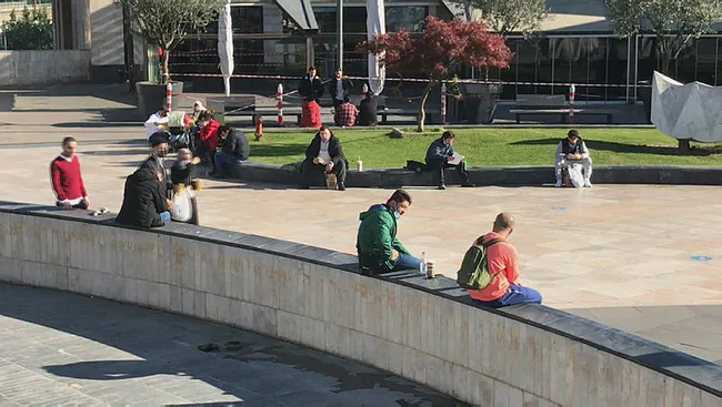 Bayrampaşa'daki alışveriş merkezi önünde bulunan oturma alanları ile süslemelerin bulunduğu taşlara oturan bazı vatandaşlar burada toplanarak yemeklerini yedikleri görüldü. Zaman zaman sosyal mesafeye uymayan ve sigara içen vatandaşları güvenlik görevlileri uyardı.