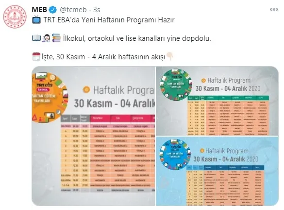 Bakan Ziya Selçuk, bir diğer paylaşmında "Sınav grubu öğrencilerimiz için TRT EBA kanallarında hafta sonları "Sınav Özel" yayınlarımız var. Evinde televizyonu olan her öğrencimiz, köyde de olsa şehirde de olsa derslere katılabiliyor, her ders için soru çözümlerini ve anlatımları izleyebiliyor. Her yerde eğitime devam" mesajını verdi.