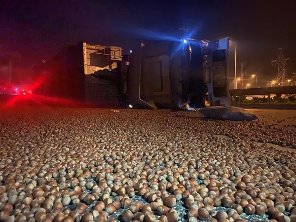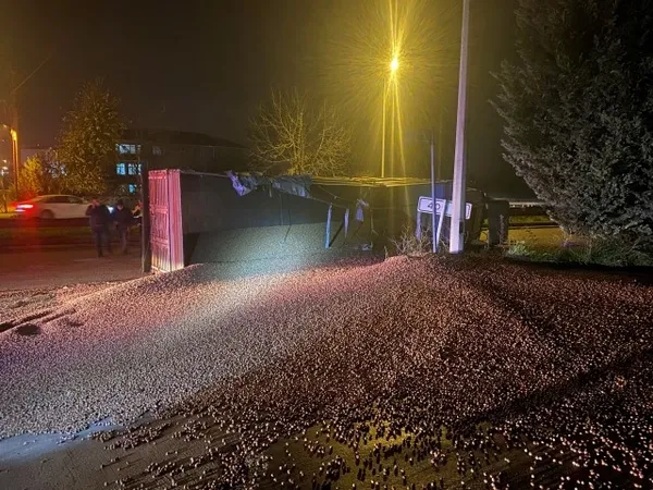 Düzce'de fındık yüklü tır devrildi! Yol fındık tarlasına döndü
