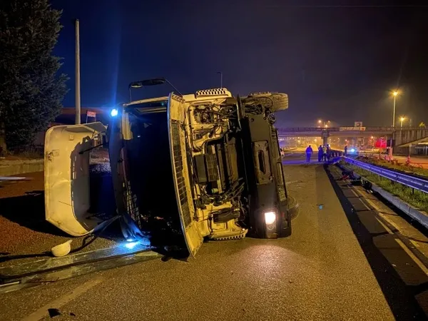 Edinilen bilgilere göre, Sakarya'dan Düzce istikametine seyir halinde olan Necdet Ç. idaresindeki 54 B 1266 MAN marka tır Cumayeri sapağında yol yapım çalışması nedeniyle ikiye ayrılan yolda sürücüsünün direksiyon hakimiyetini kaybetmesi sonucu yan yattı.