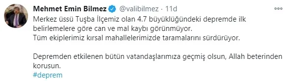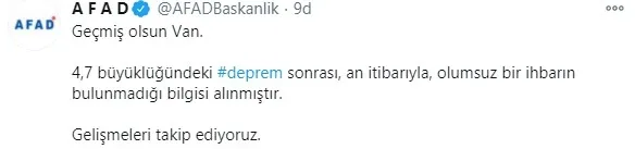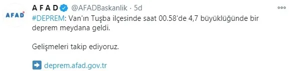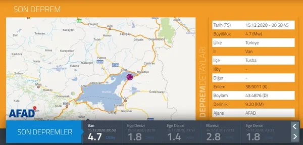 SON DAKİKA HABERİ: Afet ve Acil Durum Yönetimi Başkanlığının (AFAD) internet sitesinde yer alan bilgiye göre, saat 00.58'de merkez üssü Van'ın Tuşba ilçesi olan 4,7 büyüklüğünde deprem kaydedildi.