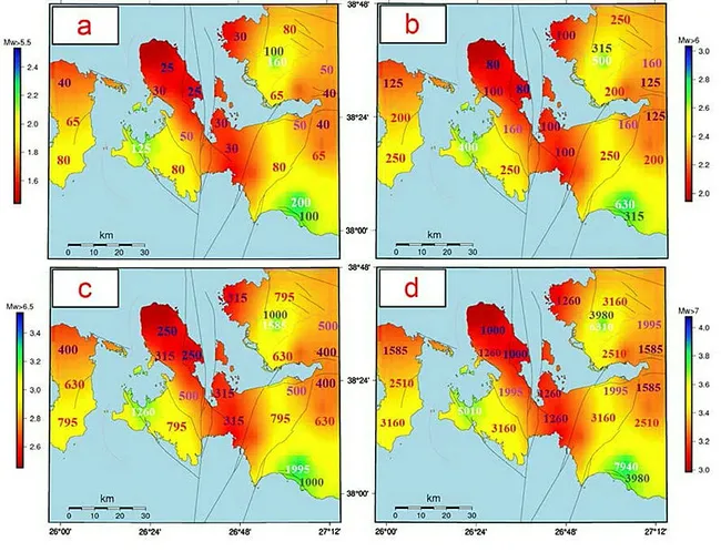 "Bizim bu bölgede yaptığımız bir çalışma var. 'Jeodezik deprem tekrarlama aralığı' adlı bu çalışma, yeni yayınlandı. Bölgesel ölçekte özellikle İzmir metropol alanı ve Karaburun yarımadasında hangi büyüklükteki depremin ne zaman olma olasılığı tespit edildi. Örneğin 5.5 büyüklüğündeki depremin 25- 30 yılda bir gerçekleşeceği ortaya çıktı."