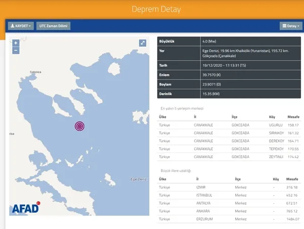 Depremin 15,35 kilometre derinlikte olduğu ve Çanakkale'nin Gökçeada ilçesine 155,72 kilometre yakınlıkta gerçekleştiği belirlendi.