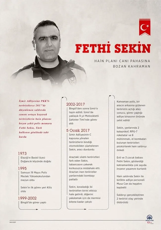 İzmir Adliyesinde 4 yıl önce meydana gelen terör saldırısında, teröristlere çatışan polis memuru Fethi Sekin ve mübaşir Musa Can şehit olmuş, 3'ü polis 7 kişi yaralanmıştı.