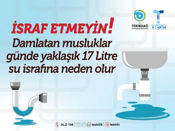 Tekirdağ Su ve Kanalizasyon İdaresince (TESKİ) içme suyuyla ilgili yapılan uyarıda, “Damlatan musluk günde 17 litre su israfına neden olur” ifadelerine yer verildi.