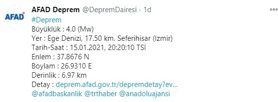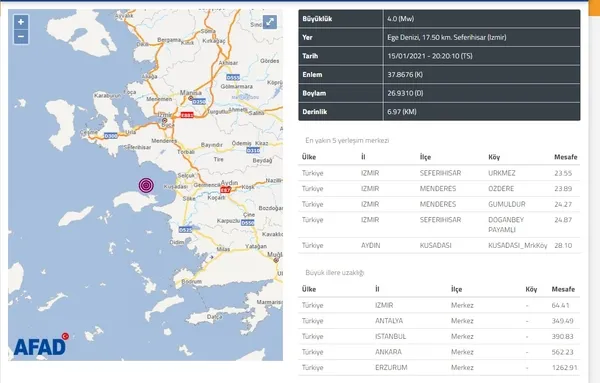 SON DAKİKA HABERİ: Afet ve Acil Durum Yönetimi Başkanlığı (AFAD) verilerine göre; saat 20.20'de İzmir'in Seferihisar ilçesi açıklarında 6.97 kilometre derinliğinde ve 4 büyüklüğünde bir deprem meydana geldi.