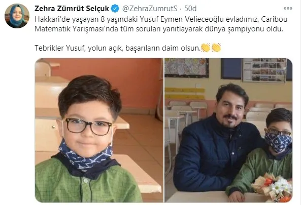 Selçuk, paylaşımında, "Hakkari'de yaşayan 8 yaşındaki Yusuf Eymen Velieceoğlu evladımız, Caribou Matematik Yarışması'nda tüm soruları yanıtlayarak dünya şampiyonu oldu. Tebrikler Yusuf, yolun açık, başarıların daim olsun." ifadesini kullandı.