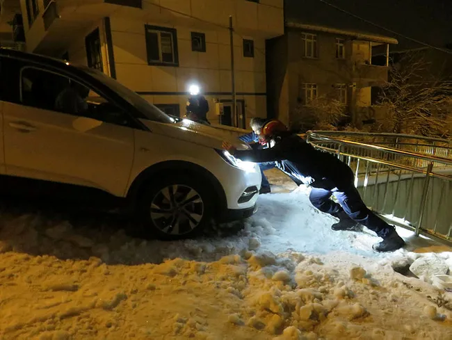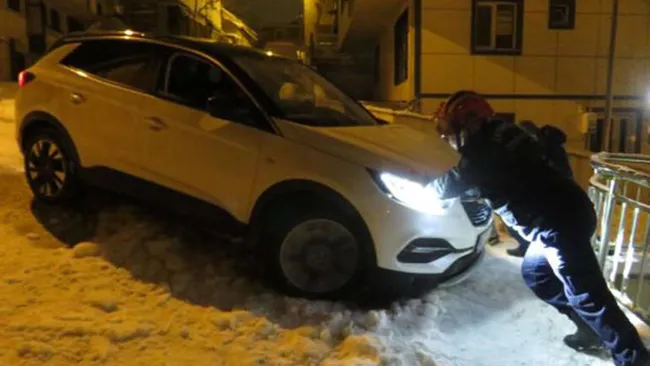 İhbar üzerine olay yerine gelen ekipler yerdeki buzları kırarak otomobili kurtardı.