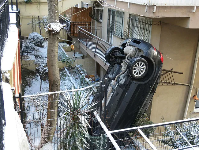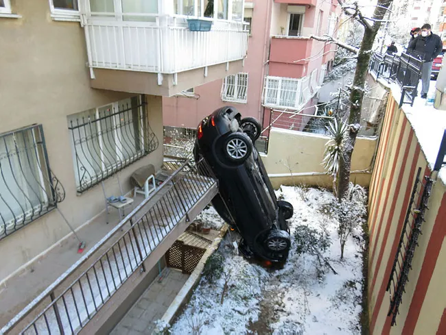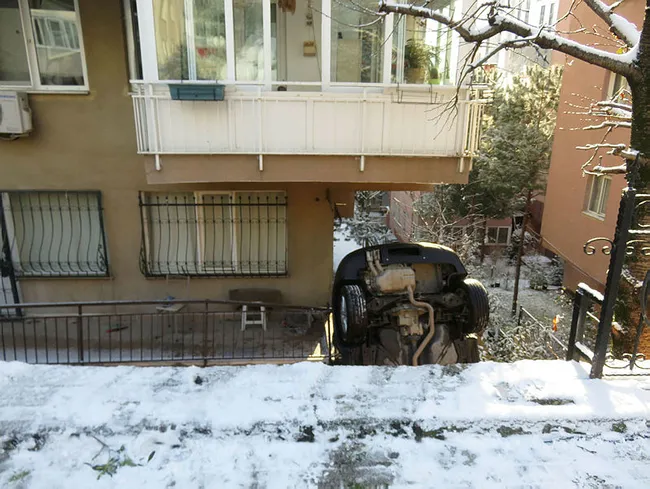 Üsküdar'da saat 09.30 sıralarında Acıbadem Mahallesi, Başöğretmen Sokak'ta buzlanan yolda sürücüsünün direksiyon hakimiyetini kaybettiği otomobil demir bariyerleri parçalayarak apartmanın bahçesine uçtu. 3 metre yükseklikten düşen araç dik durdu. Balkondan destek alarak dik duran araçtaki sürücü vatandaşlar tarafından kurtarıldı.