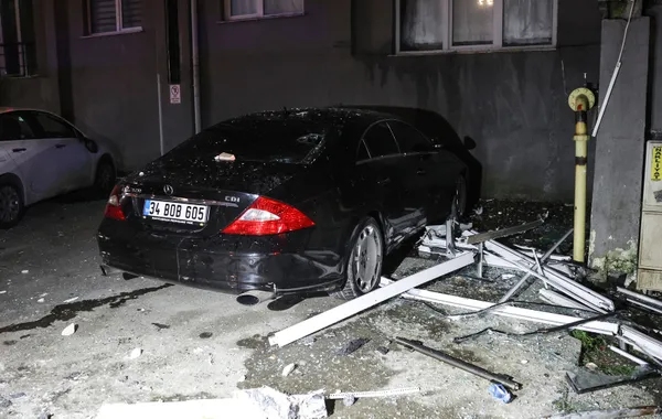 Patlama sebebiyle çıkan yangın binada, etrafa saçılan beton parçaları da park halindeki bir lüks araçta hasara sebep oldu.