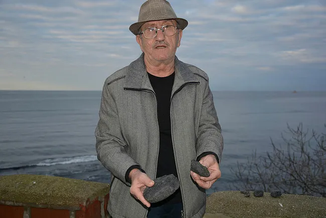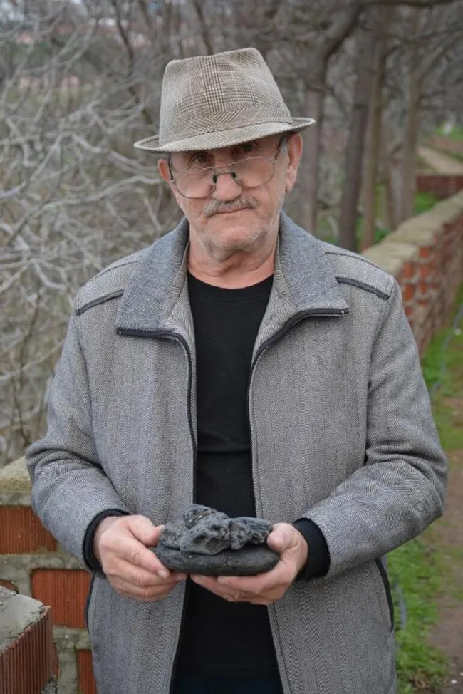 Sinop'ta yaşamını sürdüren 64 yaşındaki Durmuş Yalçın arazisinde gezerken gök taşı düştüğünü söyledi. Taşı eline aldığında ateş gibi olduğunu söyleyen Durmuş Yalçın 10 parça siyah taşı satışa çıkardı.