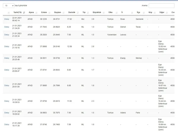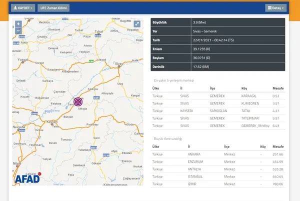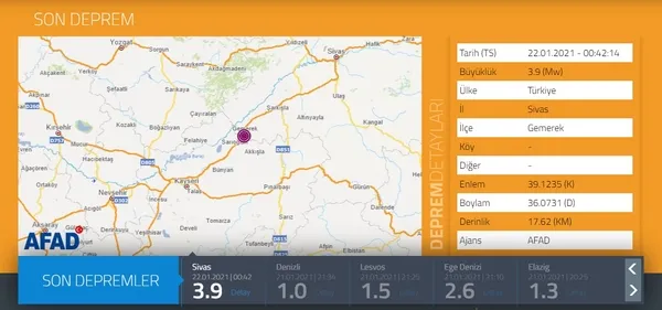 SON DAKİKA: Afet ve Acil Durum Yönetimi Başkanlığı (AFAD) verilerine göre; Sivas Gemerek'te saat 00:42'de 3,9 şiddetinde bir deprem meydana geldi.