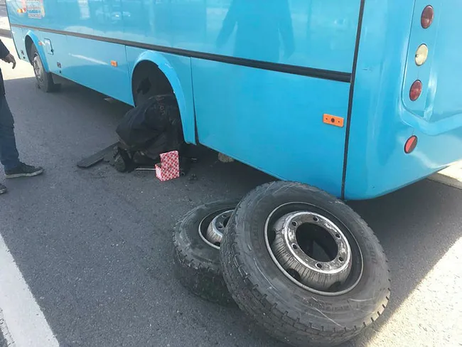 Tekerleklerden birisi refüjdeki demir korkuluklara çarparak durdu. İkinci tekerlek ise bulvar üzerinde yaklaşık 500 metre ileride kaldırımda yürüyen A.B.'ye (74), ardından iki otomobile çarptı.