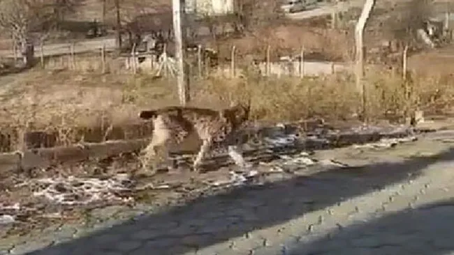 Sivas’ın Divriği ilçesinde nesli tükenme tehlikesi altındaki vaşak ilçe merkezine indi. Caddede gezinen vaşak bir süre sonra araziye kaçarak gözden kayboldu.