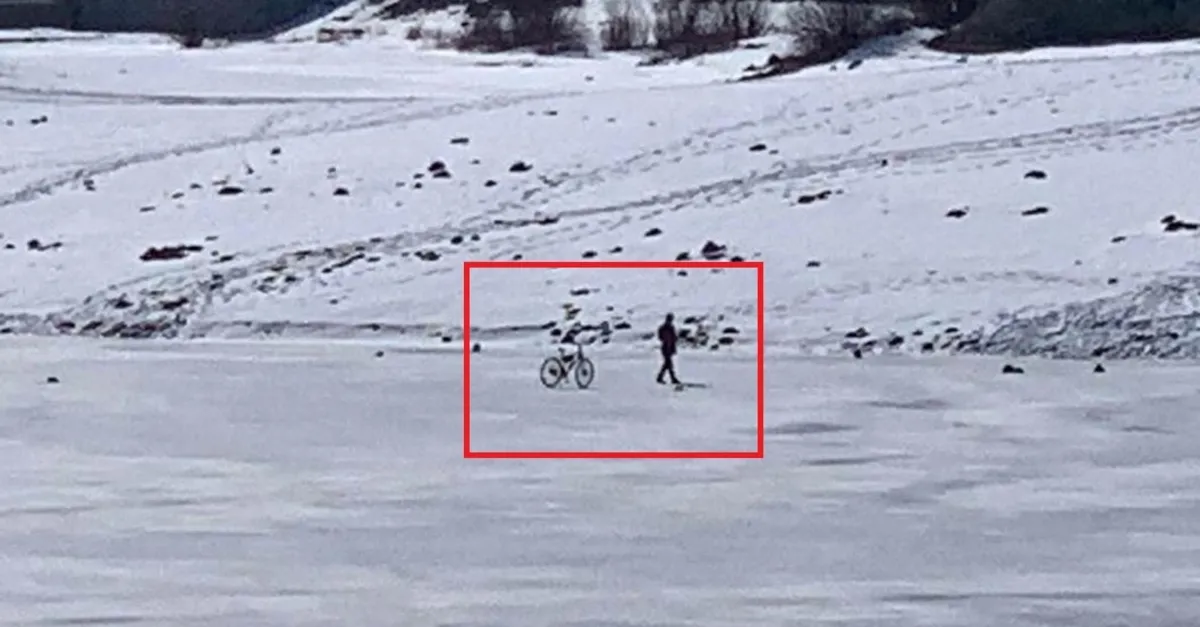 Buzla kaplı gölün üzerinde bisiklet sürdü