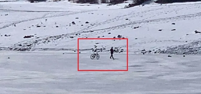 Sivas’ta büyük bir tehlikeyi göze alarak bisikleti ile donan gölün yüzeyinde yürüyen kişi görüntülendi.