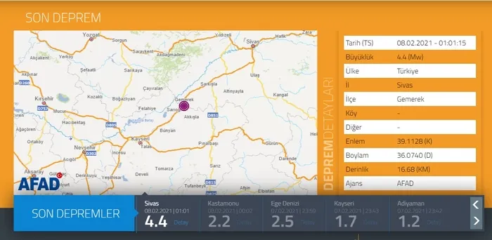 AFAD verilerine göre; Sivas'ın Gemerek ilçesinde saat 01.01'de 4,4 büyüklüğünde bir deprem meydana geldi.