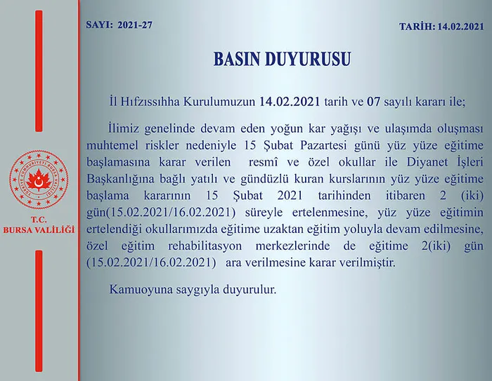 Bursa Valiliği'nden yapılan açıklamada, "İlimiz genelinde devam eden yoğun kar yağışı ve ulaşımda oluşması muhtemel riskler nedeniyle 15 Şubat pazartesi günü yüz yüze eğitime başlanmasına karar verilen resmi ve özel okullar ile Diyanet İşleri Başkanlığı'na bağlı yatılı ve gündüzlü Kuran kurslarının yüz yüze eğitime başlama kararının 15 Şubat 2021 tarihinden itibaren 2 gün süreyle ertelenmesine, yüz yüze eğitimin ertelendiği okullarımızda eğitime uzaktan eğitim yoluyla devam edilmesine, özel eğitim rehabilitasyon merkezlerinde de eğitime 2 gün ara verilmesine karar verilmiştir" denildi.
