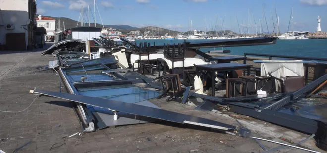 İzmir'de dün başlayan fırtına, kent genelinde hayatı olumsuz etkiledi. Ağaçlar devrildi, çok sayıda evin çatısı uçtu. Fırtınadan en çok etkilenen yer ise Urla ilçesi oldu. Saatte hızı yer yer 100 kilometreye kadar çıkan fırtınanın sahile taşıdığı dev dalgalar taşkınlara neden olurken işyerlerinde de maddi hasara yol açtı. Gece saatlerinde etkisini artıran fırtınadan dolayı restoran ve kafeteryaların masalarıyla sandalyeleri kullanılamaz hale gelirken; 1 mekanın da camları patladı. Sabahın ilk ışıklarında fırtınanın neden olduğu zararı gören Urlalılar şaşkınlıklarını gizleyemedi. Cep telefonlarıyla yaşanan hasarı görüntülediler.