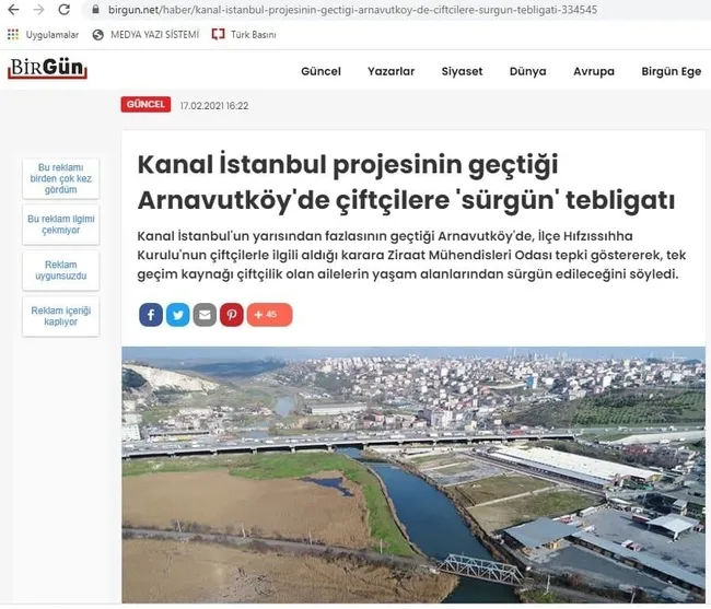FOX TV, Cumhuriyet Gazetesi, Karar Gazetesi, BirGün Gazetesi ve T24’ün “Çiftçilere Kanal İstanbul Sürgünü” başlıklı haberi ile İstanbul Ziraat Mühendisleri Odası’nın açıklamasının yalan olduğu ortaya çıktı. Arnavutköy Kaymakamlığı, bazı basın yayın organlarında yer alan 'Kanal İstanbul'un geçtiği yerlerde çiftçilerin tahliyesi isteniyor' şeklindeki haberlerin gerçeği yansıtmadığını bildirdi.