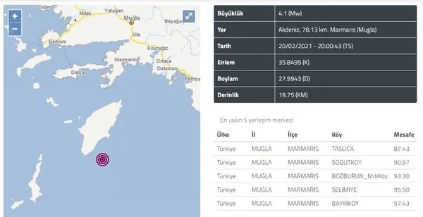 Boğaziçi Üniversitesi Kandilli Rasathanesi ve Afet ve Acil Durum Yönetimi Başkanlığı (AFAD)'ın sürekli olarak güncellediği ve kamuoyuna duyurdu son depremler listesine göre Akdeniz'de saat 20.00'de 4.1 şiddetinde bir son dakika depremi meydana geldi. Yerin 6.3 kilometre derinliğinde meydana gelen deprem Muğla ve Antalya illerimizde de hissedildi.