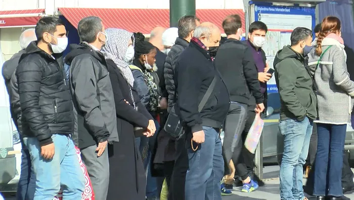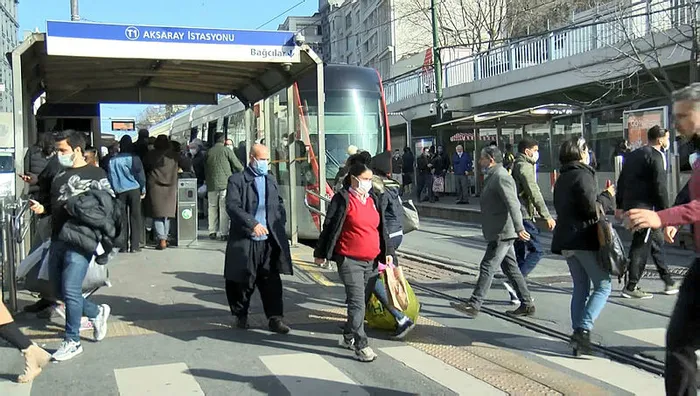 Yoğunluğun en çok olduğu yerlerden biri de Fatih Aksaray'dı. Saat 16.00'dan itibaren başlayan yoğunluk nedeniyle tramvay ve otobüs duraklarında sosyal mesafe kuralı hiçe sayıldı.