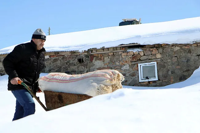 Çatılarda oluşan buz sarkıtlarının boyu 3 metreye ulaşırken, şiddetli rüzgarın taşıdığı kar ile sürekli kapanan mezra yolunda ise Büyükşehir Belediyesi ekipleri tarafından sık sık çalışma yapılıyor.