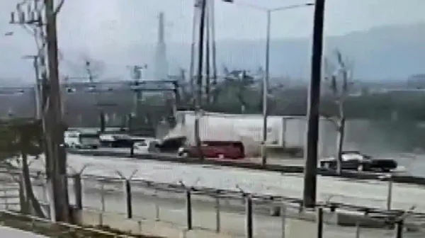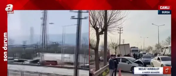 Son dakika | Bursa’da freni patlayan tır dehşet saçtı. Yolun karşı şeridine geçen tır, önüne gelen araçları biçti. Onlarca aracın hurdaya döndüğü kazada ilk belirlemelere göre 3 kişi hayatını kaybetti, çok sayıda da yaralı olduğu açıklandı. Ayrıntıları A Haber muhabiri Necat Kırbulut anlattı. Kırbulut, feci kazada yaralıların ve ölülerin olduğunu aktardı. Öte yandan kaza anı ise bir iş yerinin güvenlik kamerasına saniye saniye yansıdı. Görüntülerde TIR’ın hızla önündeki araçları teker teker ezerek ilerlediği görüldü. Kaza haberi sonrası Bursa Valisi Yakup Canbolat olay yerine gitti. A Haber'e konuşan Canbolat, 'Kaza TIR'ın freni patladığı için meydana geldi. 3 ölü, 9'u ağır 21 yaralı var' dedi.