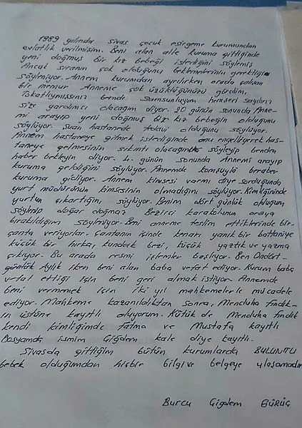 Benim kimlikteki anne-baba adım Mustafa ve Fatma yazıyordu. Memura bu yanlışlık 30 yıl önce yapılmış dedim. O da "Hayır, siz evlatlıksınız" dedi. Ne diyeceğimi, ne yapacağımı bilemedim. Yıkıldım kaldım. Memura yalvardım, "Bu isimler gerçek ailemse bulayım" diye ama hiçbir kayıt çıkmadı. "Ancak Sivas'ta yurttan bulabilirsiniz" dedi. Eve geldiğimde anneme durumu söyledim. O da bana "Evet kızım. Biz seni 1989 yılında Sivas Yetiştirme Yurdu'ndan aldık" dedi.