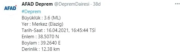 AFAD Deprem Dairesi Başkanlığından alınan bilgiye göre, saat 16.45 sıralarında Elazığ merkez üssü olan 3.6 büyüklüğünde deprem meydana geldi.