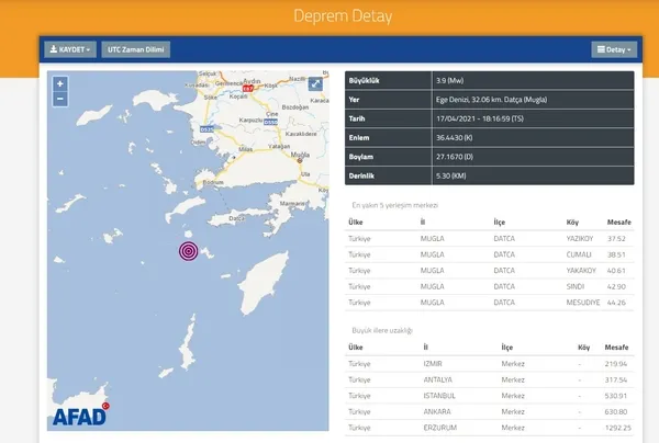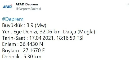 AFAD verilerine göre; Ege Denizi açıklarında Muğla'nın Datça ilçesinde hissedilen 3.9 şiddetinde bir deprem meydana geldi.