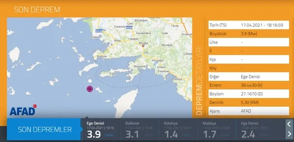 Son dakika AFAD deprem haberleri… AFAD verilerine göre; Ege Denizi açıklarında Muğla’nın Datça ilçesinde hissedilen 3.9 şiddetinde bir deprem meydana geldi. Saat 18:16’da oluşan depremin derinliği 5.30 KM olarak kayda geçti.
