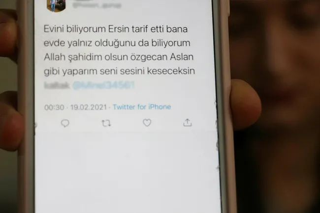 Mersin’de H.G., eski sevgilisi N.P.’nin müstehcen görüntülerini gizlice kayıt altına aldı. H.G., genç kız ayrılmak istediğinde de bu görüntüleri yaydı. H.G., tarafından sürekli tehdit edildiğini belirten genç kız, şüpheli, 'Eğer şikayetinden vazgeçmezsen seni Özgecan Aslan gibi öldürürüm' diyor.” ifadelerini kullandı.