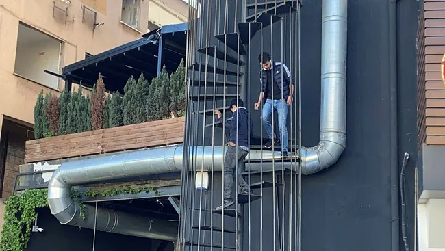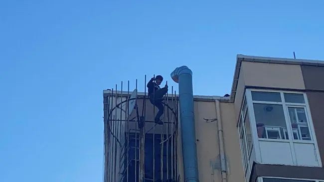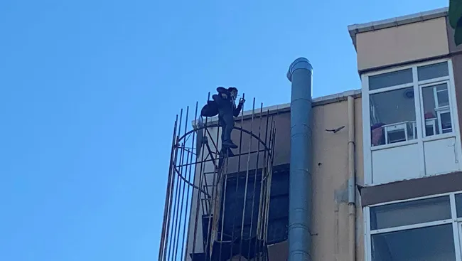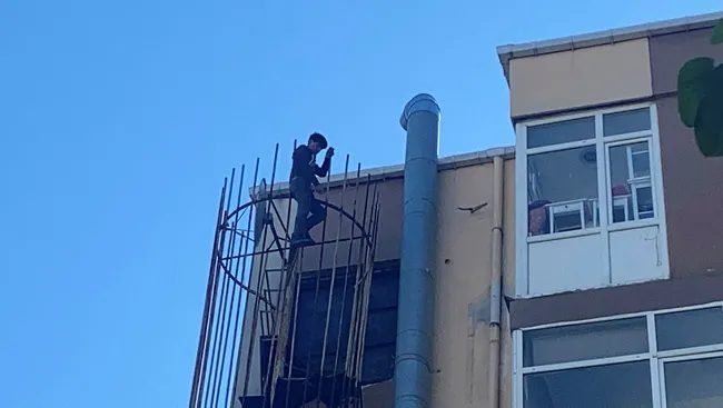 Sokak üzerindeki yangın merdiveninin giren genç, yoldan geçen bir vatandaşa "abi polisi ara" dedikten sonra tepesine çıktı.