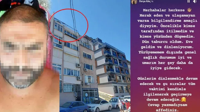 Konak ilçesinde 13 Mayıs günü Akın Simav Mahallesi Şehit Nihatbey Caddesi’nde erkek arkadaşı olduğu öne sürülen Deniz Özarslan'ın (35) 4'üncü kattaki evinin terasından düşen Derya Kılıç (24) hastanedeki tedavisinin ardından taburcu oldu. Ölümden dönen Deray Kılıç, yaşadığı kaza ile ilgili yaptığı açıklamada, 'Kimse tarafından itilmedim, kimse yüzünden düşmedim.' dedi.