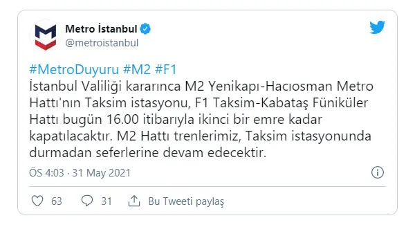 Son dakika haberine göre Metro İstanbul, İstanbul Valiliği kararınca Yenikapı-Hacıosman Metro Hattı'nın Taksim istasyonu ile Taksim-Kabataş Füniküler Hattı'nın kapatıldığını duyurdu.