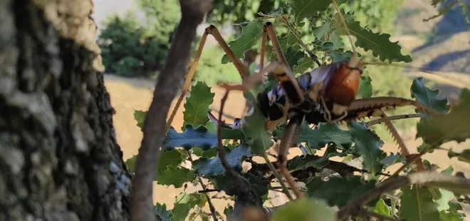 Batman'ın Sason ilçesinde yapraklar arasında bulunan dev etçil çekirge görenleri hayretler içinde bıraktı.