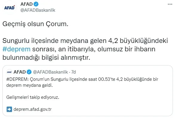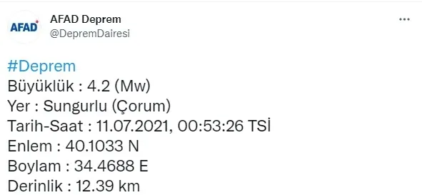 SON DAKİKA: İçişleri Bakanlığı Afet ve Acil Durum Yönetimi Başkanlığı (AFAD), saat 00:53'te Çorum'un Sungurlu ilçesinde hissedilen 4,2'lik bir deprem meydana geldiğini açıkladı.