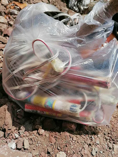 Jandarmanın yaptığı incelemede poşet içerisinde yaklaşık 15 santimetre uzunluğunda 13 adet el yapımı dinamit lokumu ile yaklaşık 100 metre uzunluğunda elektrik kablosu, 2 adet 40 santimetre uzunluğunda sivri demir ve 1 adet keser olduğu tespit edildi.