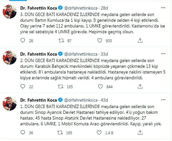 İçişleri Bakanlığı, Kastamonu, Bartın ve Sinop'taki taşkın nedeniyle vatandaşları güvenli bölgeleri terk etmemeleri ve sel bölgelerindeki yolları kullanmamaları konusunda uyardı.