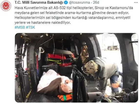 MSB'den yapılan açıklamada, ''Hava Kuvvetlerimize ait AS-532 tipi helikopterler, Sinop ve Kastamonu'da meydana gelen sel felaketinde arama-kurtarma görevine devam ediyor. Helikopterlerimizin sel bölgesinden kurtardığı vatandaşlarımız, emniyetli yerlere ve hastanelere naklediliyor.'' denildi.