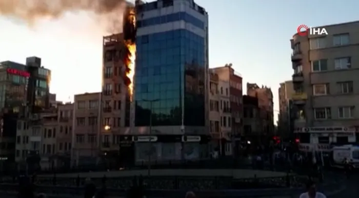 Taksim Meydanı’nda bir otelin yan cephesinde yangın çıktı. Ekiplerin yangını söndürme çalışmaları sürüyor.