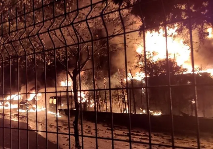 İtfaiye ekiplerinin yangına müdahale ettiği sırada yaşanan art arda patlamalarda bir metal parçasının bölgede bulunan itfaiye aracının ön camına saplandığı öğrenildi.