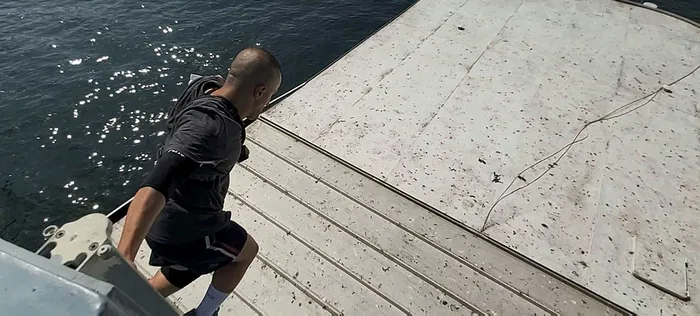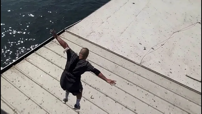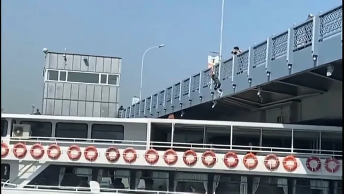 O anları kayıt altına alan Özer, sosyal medyada yayınladığı görüntülerde; ilk olarak köprü korkuluklarına tırmandı, daha sonra köprünün altından geçen geminin üzerine atladı.